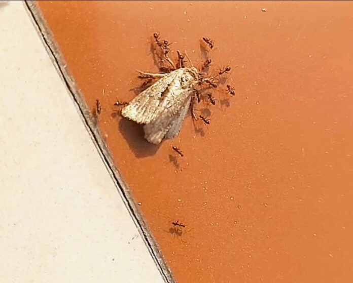 In this clip we observed a Moth (Clothes Moth- Tineola bisselliella) being transported collectively by team of small black ants. It is only later that we realised that it was mobbed and was alive. Right or wrong, I did rescue it and put it away from the ants but what interested me was the mechanism of this collective transport.