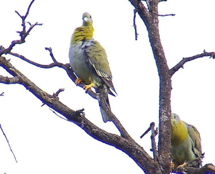 The Yellow-Footed Green Pigeon (Treron phoenicopterus) is an arboreal bird about 33 cm long with a weight of 226-248 grams found in the Indian subcontinent, parts of south east Asia. Mostly moving amongst trees, it is rarely observed on ground where it may come to visit salt-licks. It is non migratory but may move in winters from higher latitudes to lower areas. An upper elevation limit of 2410 meters has been recorded. They may also move in response to availability of food and are social birds, foraging in flocks and feeding on mostly raw fruits or succulent fruits. They also help in the propagation of plant species by seed dispersal. Sexes are similar. Yellow footed green pigeons are monogamous, generally breeding from March to June. The pairing in this clip was observed in March at the Jim Corbett National Park, Ram Nagar, Uttarakhand, India. Nesting is on trees or sometimes on shrubs. Nest is a platform of twigs, grasses, leaves and feathers constructed by both the parents in about a week. The females may lay 02 eggs. According to the IUCN Red list, 2024 the yellow-footed green pigeon is classified as a species of least concern. The species is regarded as the State Bird of Maharashtra, India.